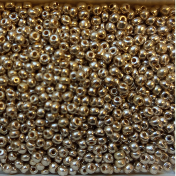 ×Rokail (rokajl, rocailles) - skleněné korálky. Velikost 9/0 = 2,6 mm. Barva:světle zlatá kovová. Kvalitní zboží české výroby. Barva na fotu se může lehce lišit v závisloti na zobrazení displeje.