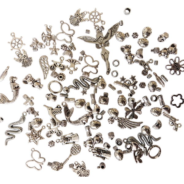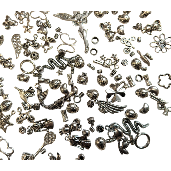 Váha balení je 150 g. Obsahuje cca 80 ks korálků a cca 80 ks přívěsků v glavanizaci stříbro, platina, starostříbro. Dodáváno v praktické stohovatelné plastové dóze o rozměru cca 11 x 5,5 cm. Obsahuje mnoho různých tvarů a velikostí. V každém balení originální mix komponentů. Může být použito i v různých tvořivých kolektivech, každý si najde to své :)